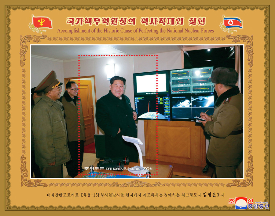 Έκτος από τον πύραυλο τα γραμματόσημα δείχνουν και τον ηγέτη της Βορείου Κορέας, Κιμ Γιονγκ Ουν, να επιθεωρεί την εκτόξευση.
