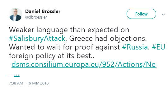 Σύμφωνα με αρκετά γερμανικά κυρίως ΜΜΕ, η Ελλάδα ήταν η χώρα που είχε μπλοκάρει προσφάτως την σκληρή καταδίκη της Ρωσίας από το Ευρωπαϊκό Συμβούλιο των υπουργών Εξωτερικών των 28 κρατών – μελών, μετά το περιστατικό στο Σαλίσμπουρι.