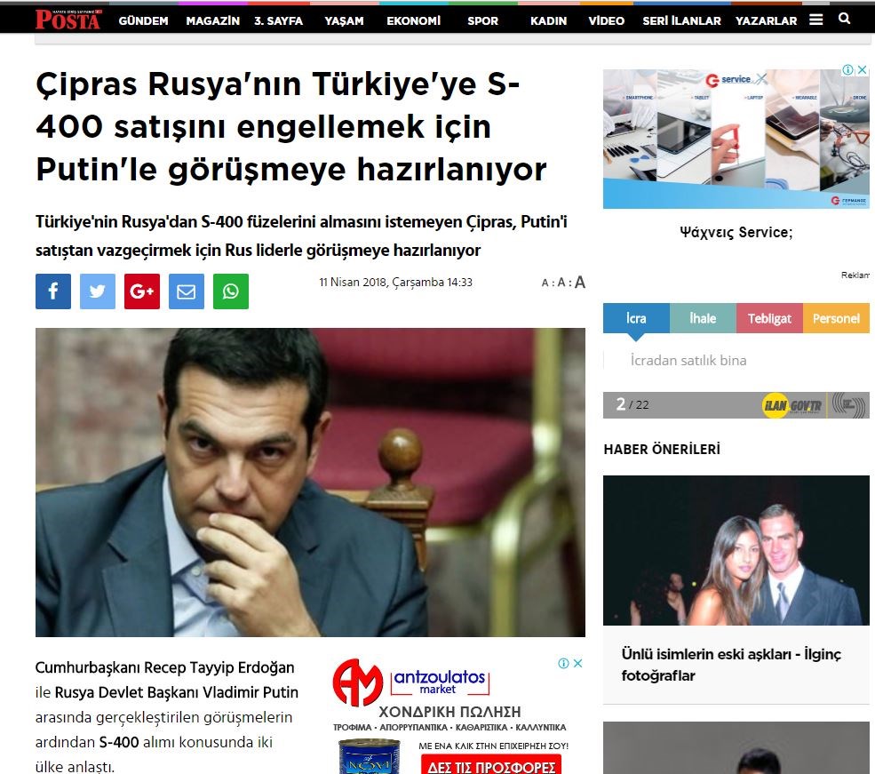 Όπως αναφέρει το ρεπορτάζ του «posta.com.tr», ο Πρωθυπουργός προετοιμάζεται για το ταξίδι στη Ρωσία και τη συνάντηση με τον Πούτιν, με το ρεπορτάζ να επισημάνει ότι «ο Αλέξης Τσίπρας θα προσπαθήσει να εμποδίσει την πώληση των S-400 αποθαρρύνοντας τον Ρώσο Πρόεδρο να προχωρήσει σ’ αυτή».