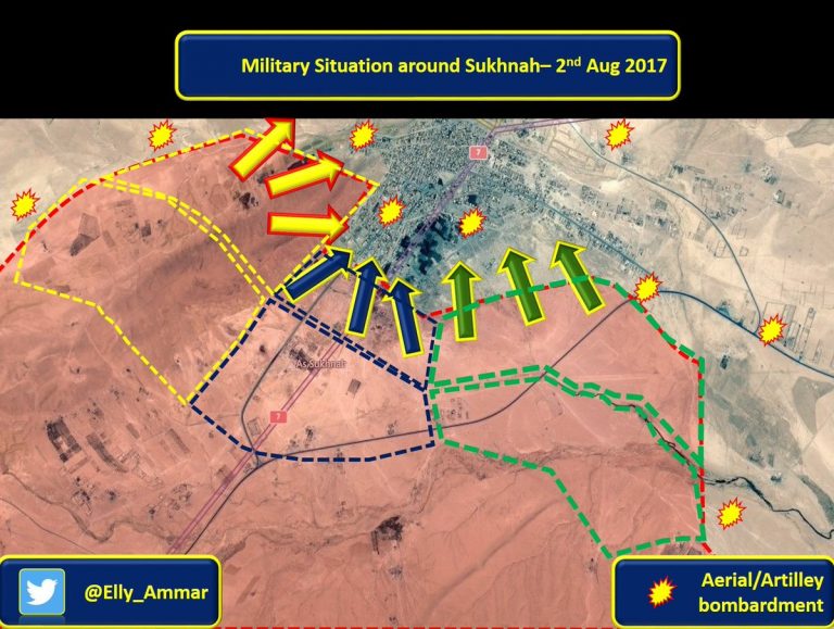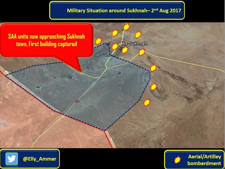 Σύμφωνα με κυβερνητικές πηγές, ο Συριακός Αραβικός Στρατός (SAA) ξεκίνησε την επίθεση του στο ISIS στη στρατηγική πόλη Σόχνα στην ύπαιθρο του ανατολικού Homs. Η SAA κατέλαβε το βουνό Tunotur δυτικά της Sukhna, φέρεται να εισέβαλε στη νοτιοδυτική είσοδο της πόλης και κατέλαβε διάφορα κτίρια. Από την πλευρά του, το υπουργείο Άμυνας της Συρίας επιβεβαίωσε ότι η SAA είχε καταλάβει όλες τις οχυρώσεις του ISIS νότια και δυτικά της πόλης Σόχνα.