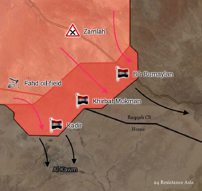 Η ταξιαρχία «Τίγρης» του Συριακού Στρατού και οι φιλοκυβερνητικές πολιτοφυλακές, απελευθέρωσαν από το ISIS τα χωριά Bi’r Rumaylan, Khirbat Mukmān και Kadir στα διοικητικά σύνορα των πόλεωνΧόμς-Ράκα μετά από μια επιτυχή αντεπίθεση ενάντια στους τρομοκράτες του ISIS στην περιοχή.