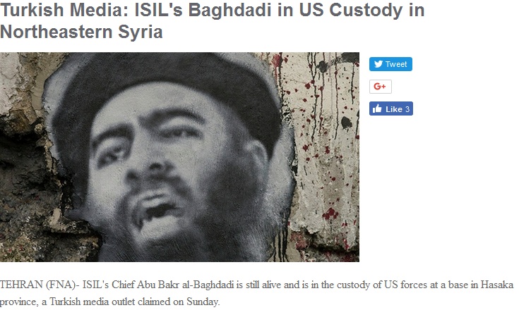 Την ίδια ώρα η τουρκική εφημερίδα Yeni Şafak επικαλούμενη συριακές πηγές αναφέρει ότι ο ηγέτης της ISIS al-Baghdadi κρατείται από τις ΗΠΑ στην περιοχή al-Karamah της βορειοανατολικής Συρίας. Όπως αναφέρει το τουρκικό δημοσίευμα ο Baghdadi συνελήφθη στο Ιράκ και στη συνέχεια είχε μεταφερθεί στην αεροπορική βάση Ra’as al-Ein πρν μεταφερθεί σε αμερικανική βάση στην περιοχή της al-Hasaka, όπου βέβαια πραγματοποιείται και η συγκρότηση του NSA.