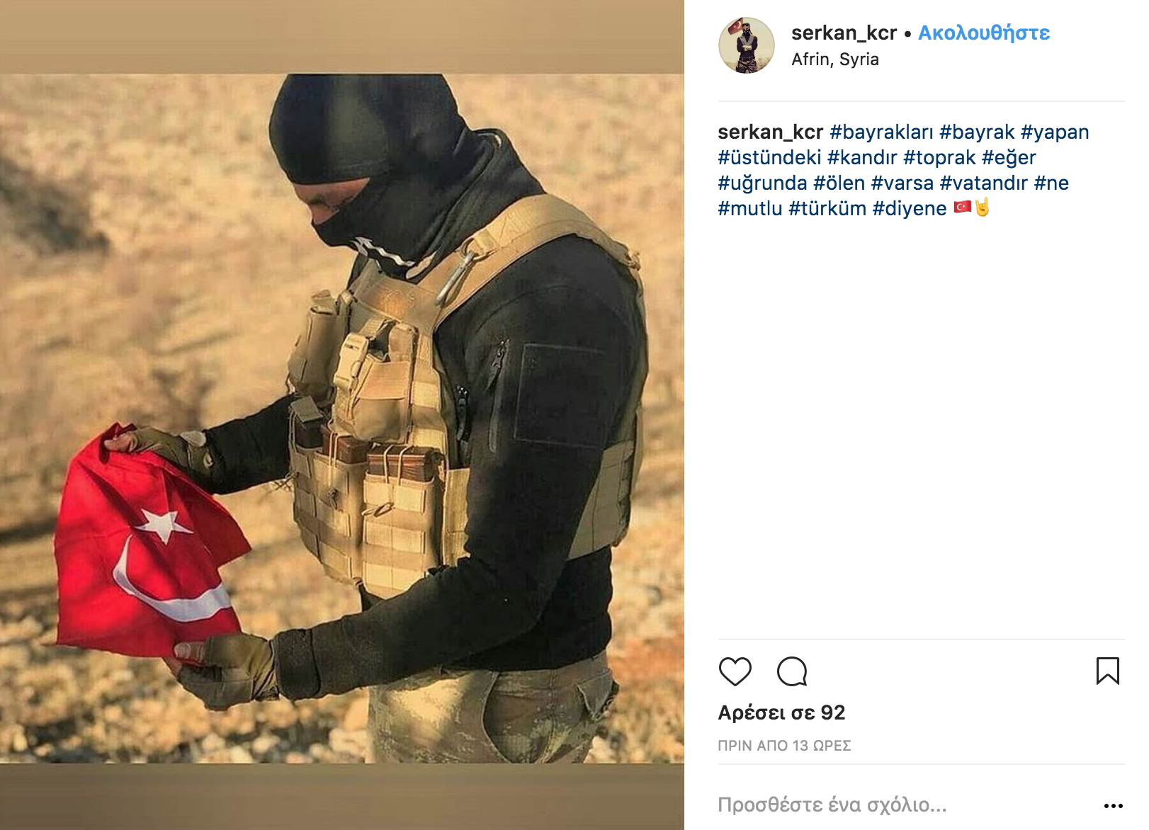 Σάλος έχει προκληθεί στο διαδίκτυο τα τελευταία 24ωρα με τις συνεχείς αναρτήσεις Τούρκων στρατιωτών στο Instagram από την Αφρίν της Συρίας κατά την διάρκεια της επιχείρησης «Κλάδος Ελαίας» με τους επιτελείς τους να «πονοκεφαλιάζουν» από αυτό το γεγονός.