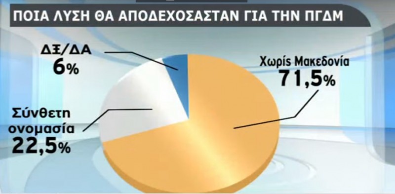 Πιο αναλυτικά, το 71,5% δεν αποδέχεται τη χρήση του όρου «Μακεδονία», την ώρα που το 22,5% λέει «ναι» σε σύνθετη ονομασία και το 6% δεν απαντά.