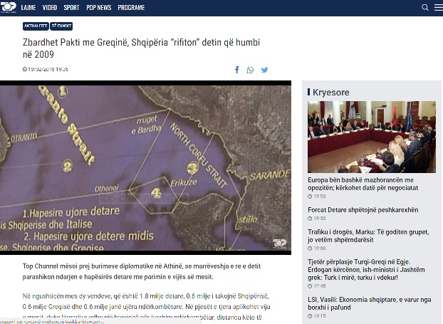 Το Top Channel των Τιράνων, επικαλούμενο διπλωματικές πηγές από την Αθήνα δημοσιοποίησε Πληροφορίες για την επικείμενη συμφωνία Ελλάδας -Αλβανίας για τα θαλάσσια σύνορα στο Ιόνιο Πέλαγος.