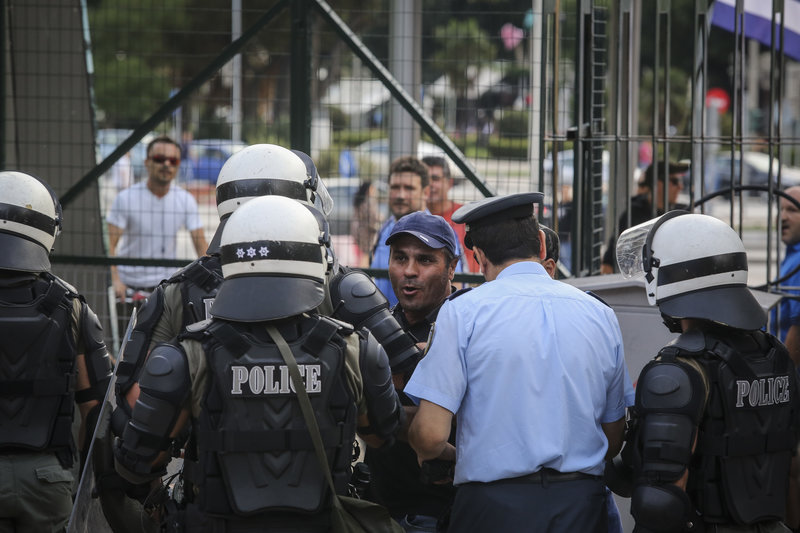 Οι συγκεντρωμένοι επιχείρησαν να μπουν στο συνεδριακό χώρο, αλλά βρέθηκαν αντιμέτωποι με τις κλειστές πόρτες και τις διμοιρίες των ΜΑΤ, οι άνδρες των οποίων δεν επέτρεψαν την είσοδο των πολιτών, που κρατούσαν ελληνικές σημαίες.