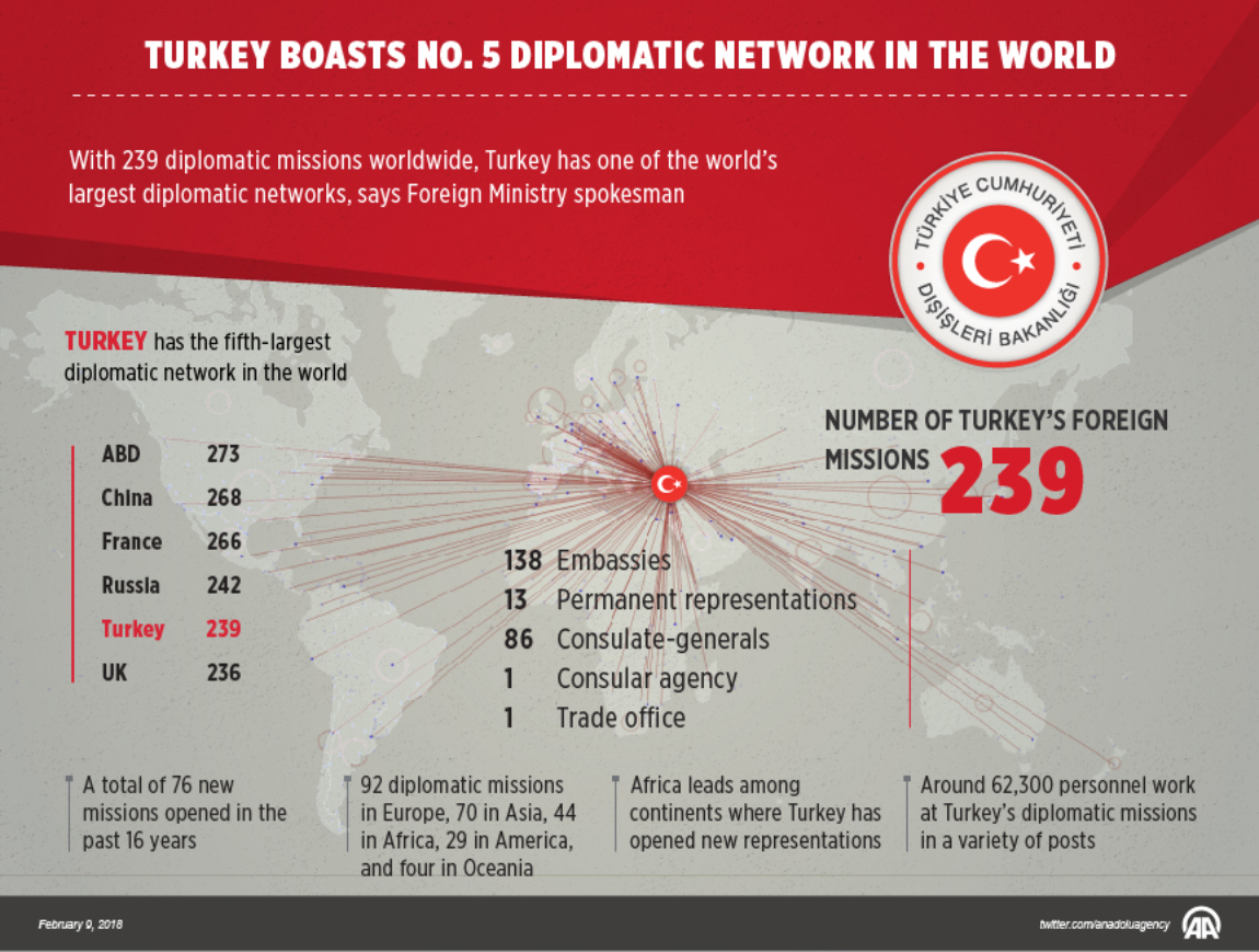Η Τουρκία κατατάσσεται στις πέντε πρώτες χώρες με βάση τον αριθμό των διπλωματικών αποστολών στο εξωτερικό, δήλωσε ο εκπρόσωπος του υπουργείου Εξωτερικών στο πρακτορείο Anadolu.
