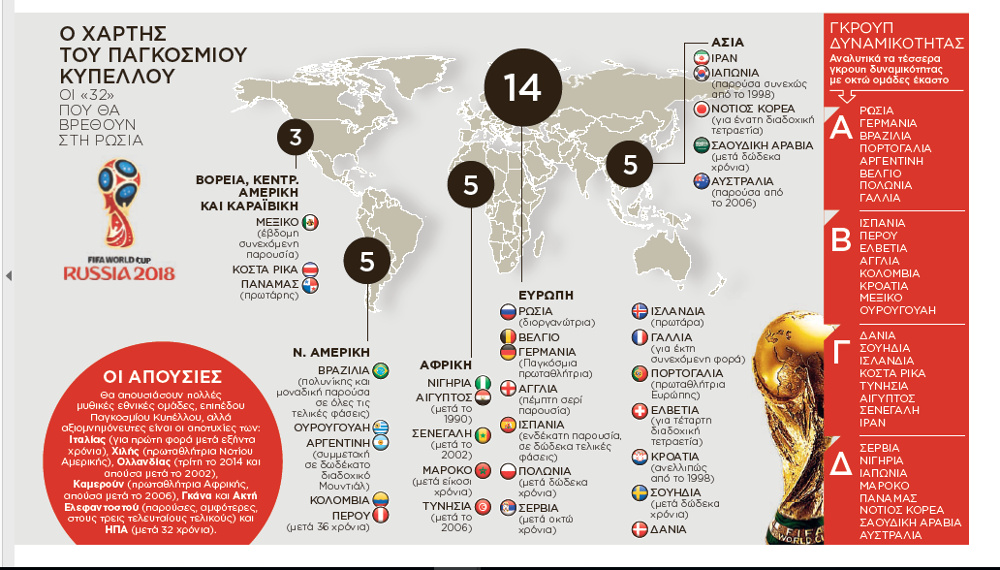 Το Μουντιάλ της Ρωσίας είναι η πρώτο που θα διεξαχθεί στην Ευρώπη μετά το γερμανικό (2006). Είναι μάλιστα το 21ο στην ιστορία και το παρθενικό της Ρωσίας και της Ανατολικής Ευρώπης. Ουσιαστικά πρόκειται για μια διοργάνωση που το ένα σκέλος της πατά στην Ευρώπη και το άλλο στην Ασία κι αυτό γιατί δύο πόλεις που επιλέχθηκαν για το τουρνουά, το Γεκατερινμπούργκ (ή Αικατερινούπολη) και το Σότσι υπάγονται στο ασιατικό τμήμα της χώρας.