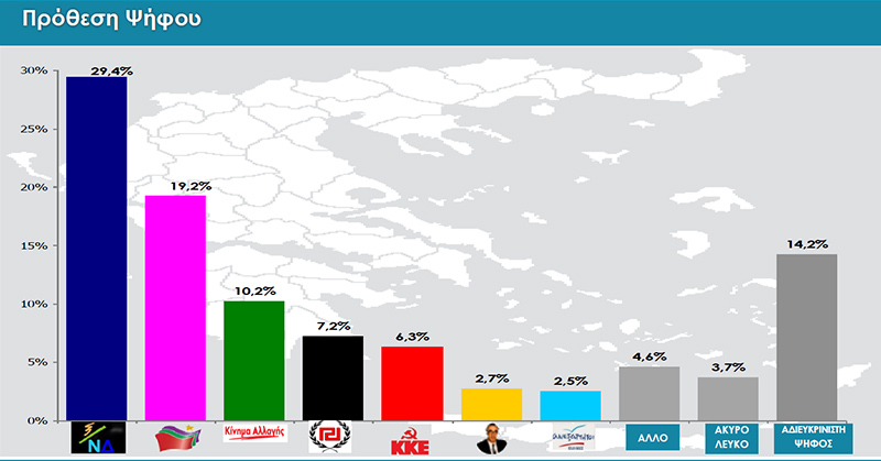 Ο ΣΥΡΙΖΑ συγκεντρώνει ποσοστό 19,2% και το Κίνημα Αλλαγής ποσοστό 10,2.