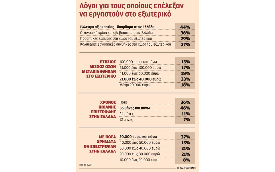 Ο βασικότερος λόγος που επικαλέστηκαν οι ερωτηθέντες από την ICAP για να δικαιολογήσουν την απόφασή τους να εργαστούν εκτός Ελλάδας «πληγώνει», καθώς δεν είναι παράγοντας που εξαλείφεται με την έξοδο από την οικονομική κρίση.