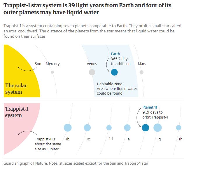 Πρόκειται για τους επτά πλανήτες με μέγεθος παρόμοιο με αυτό της Γης που περιστρέφονται γύρω από το ψυχρό αστέρι Trappist-1. Οι πλανήτες αυτοί ανακαλύφθηκαν μέσα στο 2017 σκορπίζονας ρίγη ενθουσιασμού σε όσους ψάχνουν απάντηση στο ερώτημα «υπάρχει άραγε ζωή εκεί έξω;».