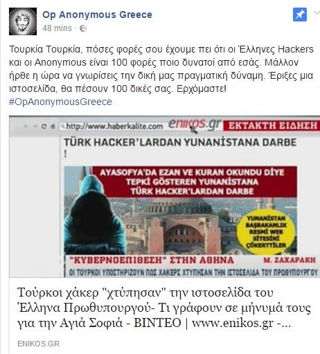 «Τουρκία Τουρκία, πόσες φορές σου έχουμε πει ότι οι Έλληνες Hackers και οι Anonymous είναι 100 φορές πιο δυνατοί από εσάς. Μάλλον ήρθε η ώρα να γνωρίσεις την δική μας πραγματική δύναμη. Έριξες μια ιστοσελίδα, θα πέσουν 100 δικές σας. Ερχόμαστε! #OpAnonymousGreece», γράφουν σε ανακοίνωσή τους.