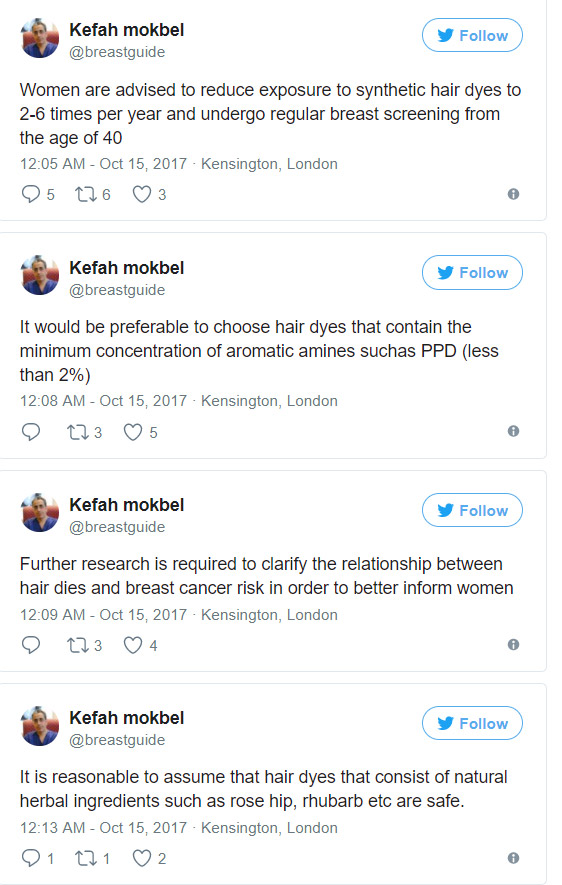 «Αν και απαιτείται περαιτέρω έρευνα και δουλειά για να επιβεβαιώσουμε τα αποτελέσματά μας, τα ευρήματά μας, υποδηλώνουν ότι η έκθεση σε βαφές μαλλιών μπορεί να συμβάλει στον κίνδυνο καρκίνου του μαστού», ενώ δεν παραλείπει να τονίσει: «Η συσχέτιση μεταξύ της χρήσης βαφών μαλλιών και κινδύνου καρκίνου του μαστού δεν αποτελεί ένδειξη σχέσης αιτίας-αποτελέσματος».