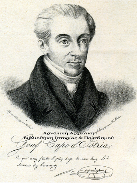 ΦΩΤΟΓΡΑΦΙΑ : Ιωάννης Καποδίστριας. Εικόνα από λιθογραφία του Μύλλερ, σχέδιο εκ του φυσικού. Φέρει την υπογραφή του Καποδίστρια με τη φράση: «Αυτό που με κολακεύει περισσότερον είναι να ζήσω εις την ανάμνησιν των ανθρώπων ». Η λιθογραφία επανεκτυπώθηκε στην Καρλσρούη με σκοπό τα έσοδα από τις πωλήσεις να διατεθούν υπέρ του Αγώνα των Ελλήνων.
