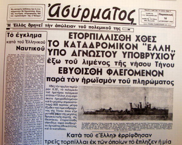 Στις αρχές Αυγούστου 1940 η διοικούσα επιτροπή του Ιερού Ιδρύματος Ευαγγελιστρίας Τήνου ζητούσε με επιστολή της προς το Υπουργείο Ναυτικών, την αποστολή πολεμικού πλοίου στο νησί ώστε να λαμπρύνει με την παρουσία του τις εορταστικές εκδηλώσεις προς τιμή της Παναγίας.