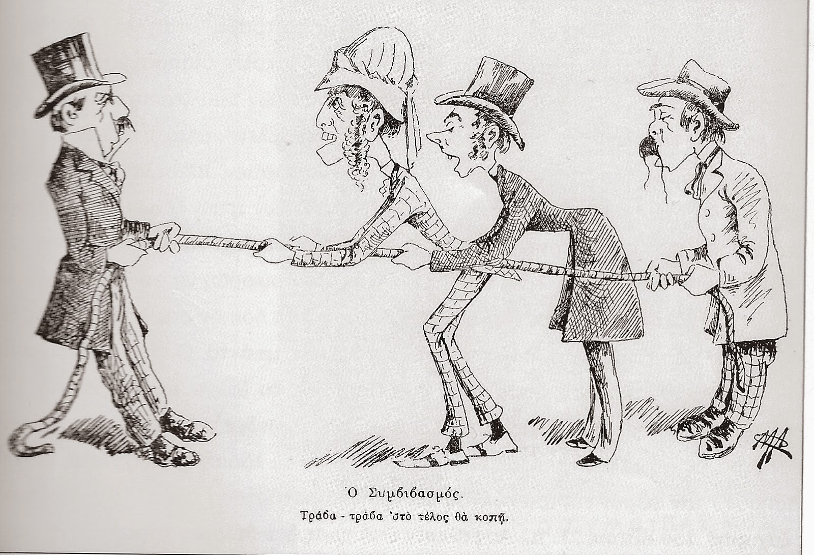Οι γελοιογραφίες που δημοσιεύτηκαν στην εφημερίδα Σκριπ [3] σχολιάζουν με ιδιαίτερα σκωπτικό τρόπο την άφιξη των αντιπροσώπων. Ένα σκίτσο του φύλλου της 29/5/1893 παρομοιάζει τις σκληρές διαπραγματεύσεις για τον συμβιβασμό με μια διελκυστίνδα μεταξύ Τρικούπη και αντιπροσώπων, επισημαίνοντας τον κίνδυνο στο τέλος “το σκοινί να κοπή”. (Εικ. 1)