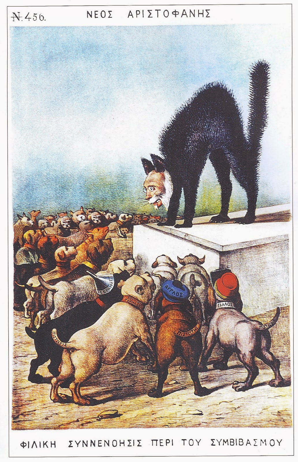 Εμπνευσμένη από την περίοδο των διαπραγματεύσεων είναι και η γελοιογραφία της… «φιλικής συνεννοήσεως περί του συμβιβασμού» [12] που απεικονίζει τον Έλληνα πρωθυπουργό σαν γάτα περικυκλωμένη από άγριους σκύλους που θέλουν να την κατασπαράξουν (Εικ. 10). Ανάμεσα στους τέσσερεις σκύλους-πιστωτές του πρώτου πλάνου, διακρίνονται στα αριστερά ένας «Εβραιογερμανός», αλλά και ένας σκέτος «Εβραίος».