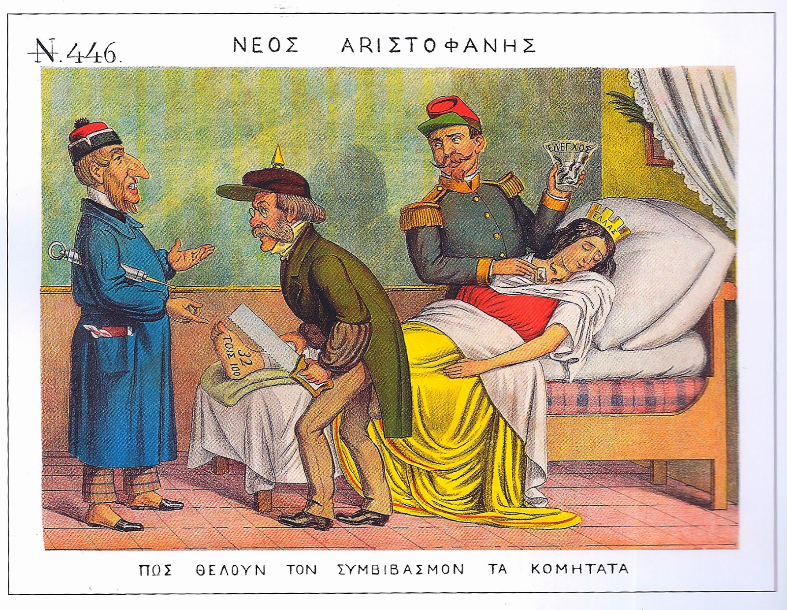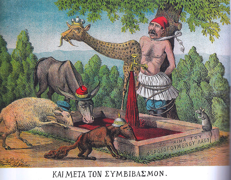 Η αφαίμαξη του ανθρώπινου σώματος ως κυριολεκτική απόδοση των δημοσιονομικών μέτρων και περιορισμών που επιβλήθηκαν για την ανόρθωση της χρεοκοπημένης ελληνικής οικονομίας είναι ένα μοτίβο που συναντάται συχνά στις γελοιογραφίες. Στις αρχές του 1895 ο Νέος Αριστοφάνης [6] δημοσιεύει μια λιθογραφία που παρουσιάζει τρία ζώα με τα εθνικά χαρακτηριστικά των Ευρωπαίων αντιπροσώπων (ο Γερμανός ξεχωρίζει από το χαρακτηριστικό πρωσικό κράνος) να πίνουν το αίμα που αναβλύζει από τα σωθικά ενός Έλληνα με τη φυσιογνωμία του Τρικούπη. Πίσω του στέκεται μια καμηλοπάρδαλη που φέρει το στέμμα και το μουστάκι του βασιλιά Γεωργίου. Η απεικόνισή του μάλλον υπαινίσσεται τις ευθύνες του ανώτατου άρχοντα για την τότε κατάσταση της χώρας. (Εικ. 4)