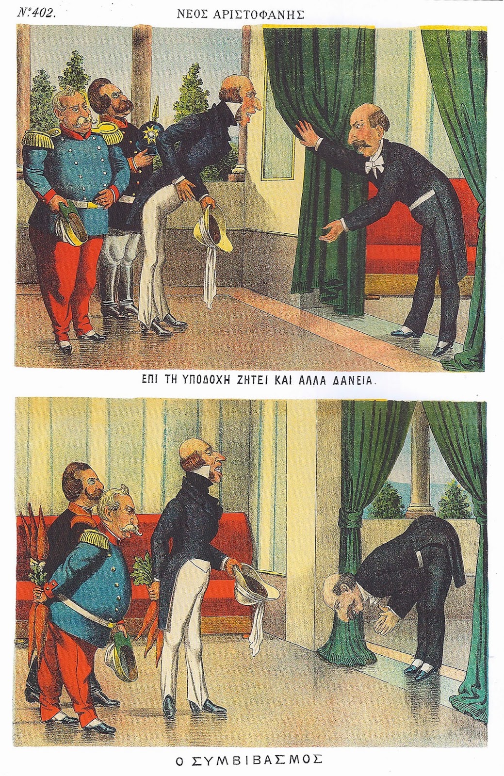 Σε διαφορετικό μήκος κύματος, η θρυλική εφημερίδα Νέος Αριστοφάνης [4] καυτηριάζει τους χειρισμούς Τρικούπη θεωρώντας τους δουλοπρεπείς. Συγκεκριμένα, παρουσιάζει τον Τρικούπη σε δύο καρέ, καταρχήν να ζητάει και άλλα δάνεια από τους αντιπροσώπους, ενώ στη συνέχεια να τους υποκλίνεται. (Εικ. 2)
