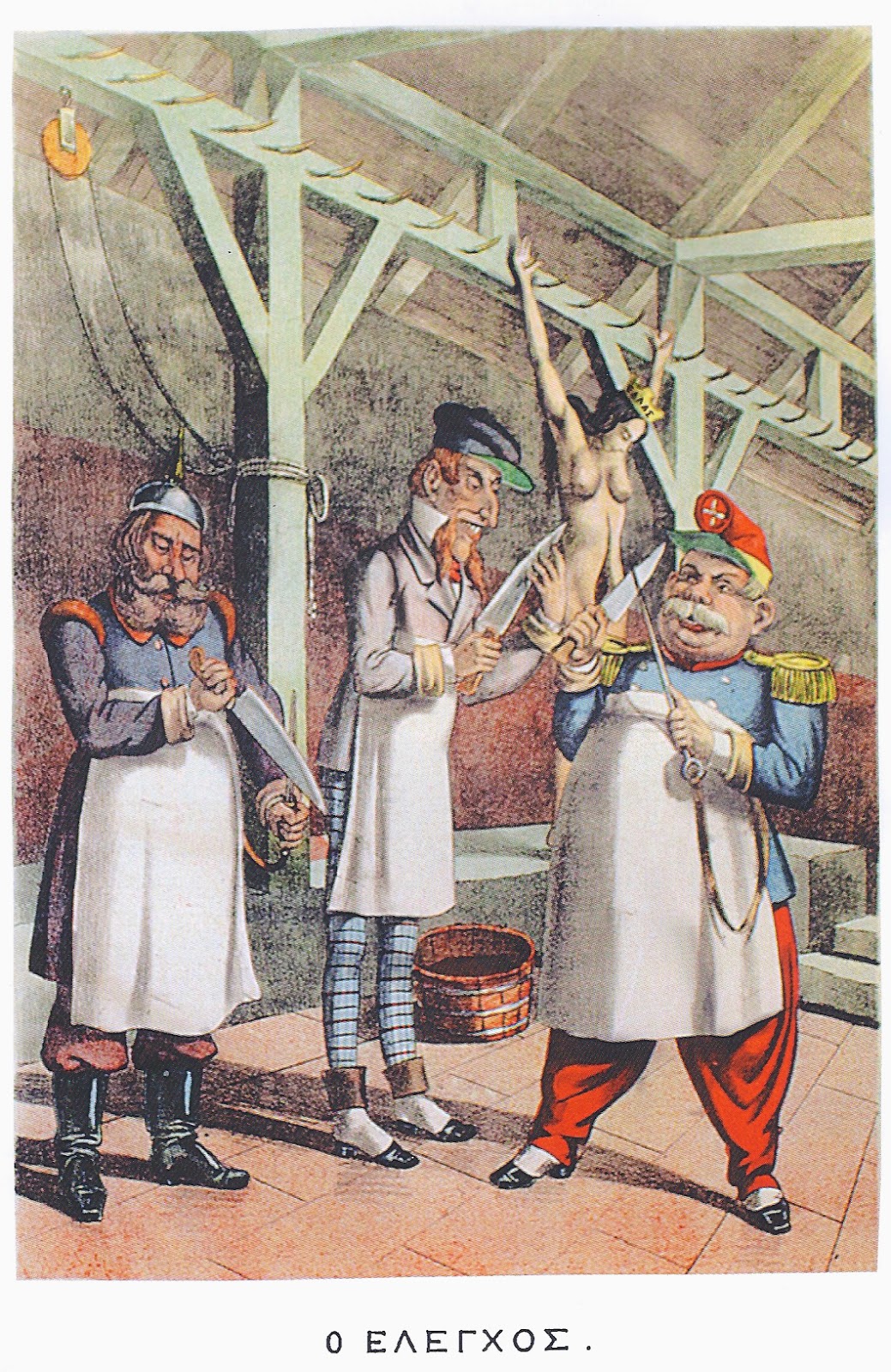 Η πληγωμένη εθνική αξιοπρέπεια είναι η πραγματική διάσταση που προβάλλεται στις γελοιογραφίες του Νέου Αριστοφάνη. [5] Σε προηγούμενο φύλλο του παρομοιάζει τον οικονομικό έλεγχο με ένα σφαγείο, στο οποίο είναι κρεμασμένο το γυμνό σώμα της Ελλάδας και οι τρεις πληρεξούσιοι (ο Γερμανός πρώτος από αριστερά) ακονίζουν τα χασαπομάχαιρά τους. (Εικ. 3)