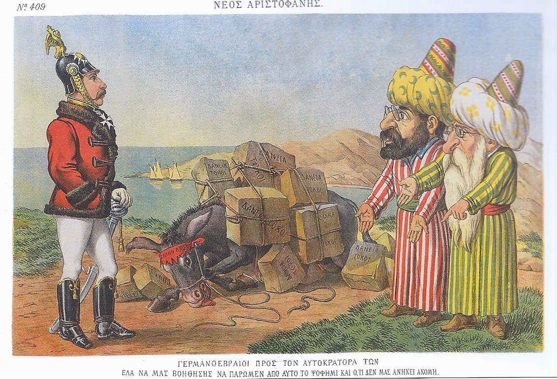 Ένα άλλο μοτίβο που συναντάται συχνά στις γελοιογραφίες είναι οι περίφημοι «Γερμανοεβραίοι (ή “Εβραιογερμανοί”) τραπεζίτες». Πρόκειται βέβαια για τους εβραϊκού θρησκεύματος Οθωμανούς τραπεζίτες της Κωνσταντινούπολης που είχαν συμμετάσχει στις χορηγήσεις δανείων προς την Ελλάδα. Οι τραπεζίτες που ζητούν την αποπληρωμή των δανείων τους από το χρεοκοπημένο βασίλειο ταυτίζονται με τη Γερμανία, αποκτώντας το προσωνύμιο των «Γερμανοεβραίων». Σε μια γελοιογραφία του Νέου Αριστοφάνη [7] οι «Γερμανοεβραίοι», διατηρώντας όλα τα στερεοτυπικά χαρακτηριστικά της παραδοσιακής αντισημιτικής εικονογραφίας και ενδεδυμένοι την περιβολή των Εβραίων Οθωμανών, παρουσιάζονται να ζητούν από τον αυτοκράτορα Γουλιέλμο να τους «βοηθήση να πάρουν από το ψοφήμι και ό,τι δεν τους ανήκει ακόμη». (Εικ. 5) Το «ψοφήμι» δεν είναι άλλο από ένα γαϊδούρι (που συμβολίζει τον ελληνικό λαό) εξαντλημένο από τα πολυάριθμα, ογκώδη φορτία με τα δάνεια και τους τόκους που του έχουν φορτώσει.