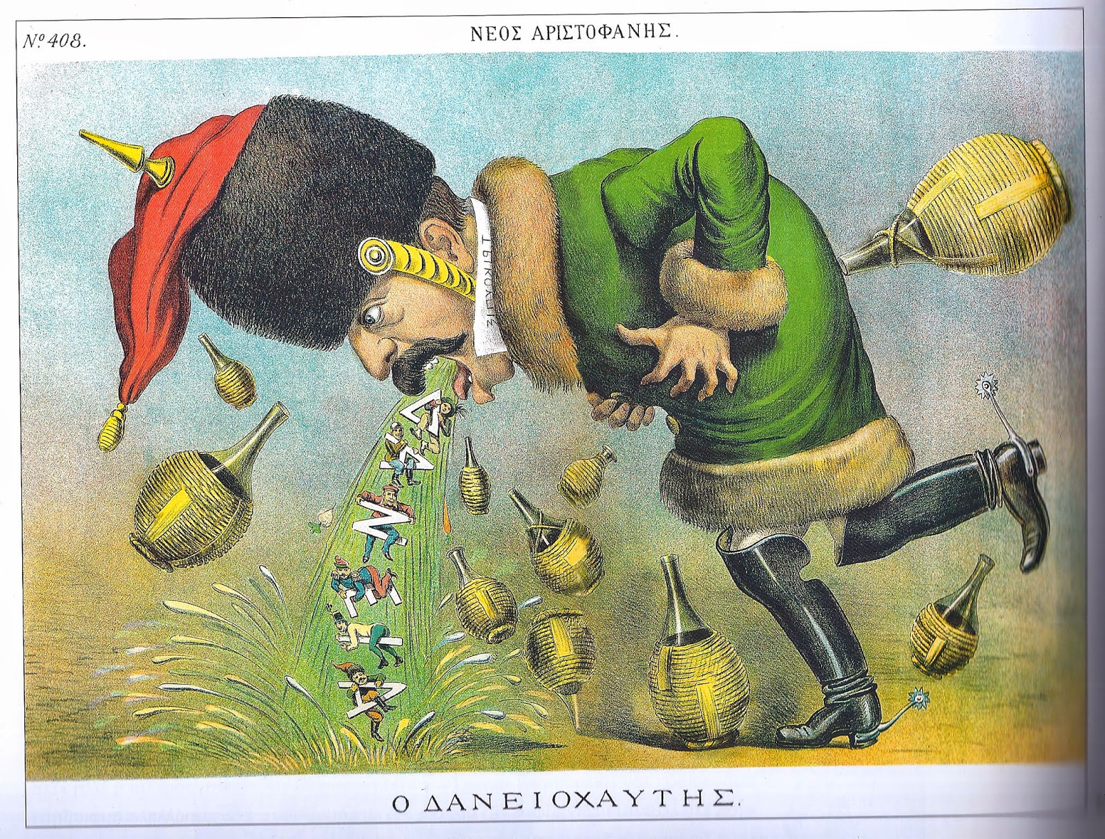 Ο οικονομικός παράγοντας θα επανέλθει στις γελοιογραφίες του Νέου Αριστοφάνη λίγο αργότερα. Μετά τη σύντομη ευφορία των πρώτων, αναβιωμένων Ολυμπιακών αγώνων που διεξήχθησαν στην Αθήνα και υπό τη βαριά σκιά του επονομαζόμενου «ατυχούς» Ελληνοτουρκικού πολέμου…
