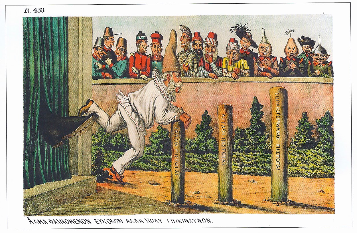 Ο Νέος Αριστοφάνης [10] τον απεικονίζει με στολή αρλεκίνου να προσπαθεί να υπερπηδήσει τα παλούκια που αντιπροσωπεύουν τις τρεις χώρες προέλευσης των ομολογιούχων, υπό τα ειρωνικά βλέμματα των ξένων (Εικ. 8). Μεγαλύτερο παλούκι είναι αυτό των «εβραιογερμανών πιστωτών».