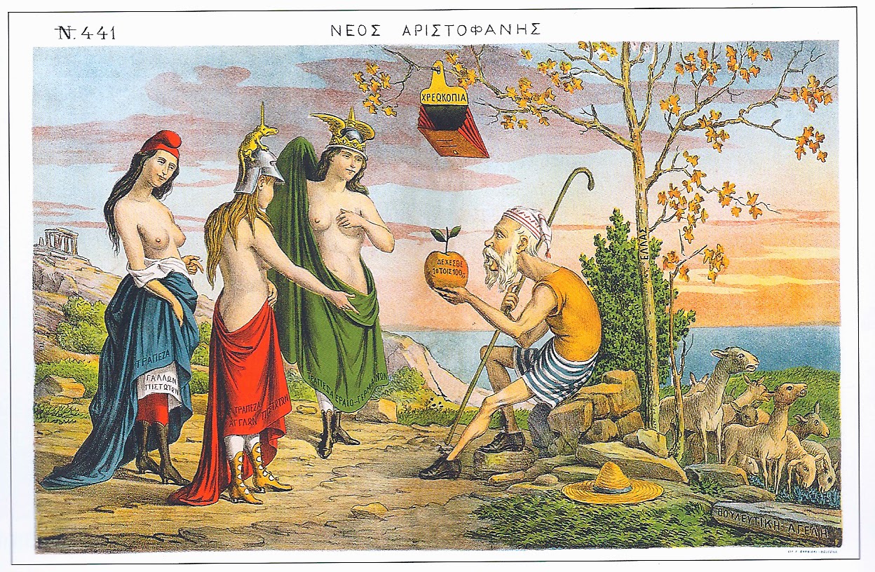 Σε άλλο σκίτσο [11], που δημοσιεύεται ενώ εξελίσσονται οι συνομιλίες ανάμεσα στους ομολογιούχους και την κυβέρνηση, παρωδείται ο μύθος του Πάρη και του μήλου της Έριδας (Eικ. 9). Σύμφωνα με αυτό, ο Δηλιγιάννης προσφέρει σε τρεις ημίγυμνες κοπέλες (που αντιπροσωπεύουν τις τράπεζες των Γάλλων, των Άγγλων και των Εβραιο-γερμανών πιστωτών) ένα χρυσό μήλο με τη φράση «Δέχεσθε 10 τοις εκατό;». Πρόκειται για το ποσοστό του τόκου των δανείων -πολύ μικρότερο βέβαια σε σχέση με αυτό που διεκδικούσαν οι πληρεξούσιοι. Κωμικοτραγική λεπτομέρεια: στα κλαδιά του δέντρου “Ελλάς” κάτω από το οποίο κάθεται ο Δηλιγιάννης, κρέμεται ένα άδειο πορτοφόλι που γράφει “Χρεοκοπία”.