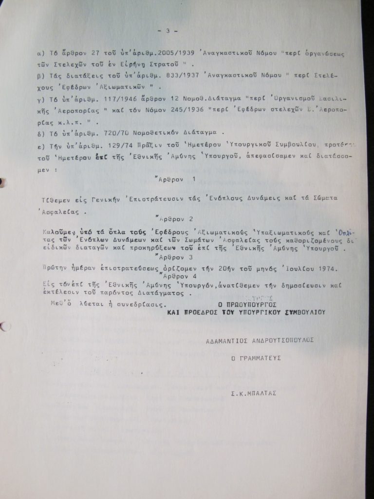 3) Πρακτικά συνεδρίασης του Υπουργικού Συμβουλίου της 20ης Ιουλίου 1974 υπό τον Πρωθυπουργό Αδαμάντιο Ανδρουτσόπουλο, όπου αποφασίζεται η κήρυξη «της Γενικής Επιστρατεύσεως της χώρας» και Πράξη Υπουργικού Συμβουλίου με τις υπογραφές των συμμετεχόντων στο Υπουργικό Συμβούλιο