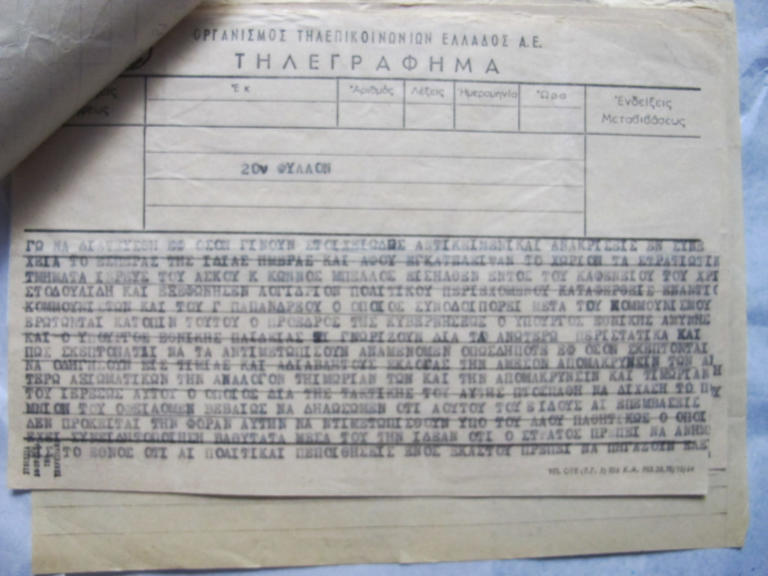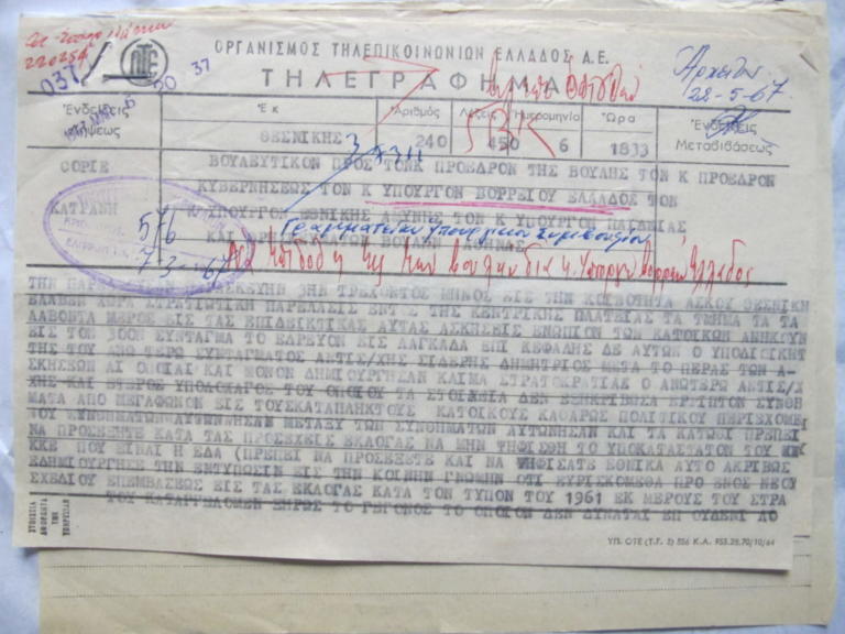 1) Τηλεγράφημα του Βουλευτή Θεσσαλονίκης της Ένωσης Κέντρου Λ. Λασκαρίδη προς τον τότε Πρόεδρο της Βουλής για ύποπτες κινήσεις στρατιωτικών σωμάτων στη Βόρεια Ελλάδα τον Μάρτιο του 1967, λίγο πριν από τις προγραμματισμένες εκλογές και το πραξικόπημα του Γ. Παπαδόπουλου.