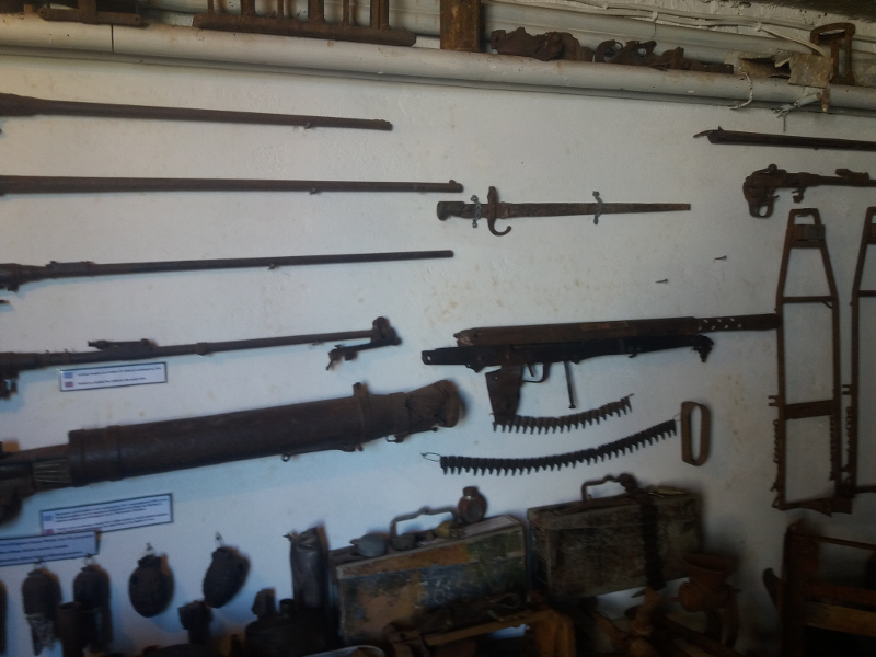 Πυροβόλα, πυρομαχικά, κράνη, στολές, εξαρτύσεις, όπλα, τμήματα από Βρετανικά και Γερμανικά οχήματα, από άρματα μάχης, μοτοσικλέτες, κομμάτια από αεροσκάφη συνθέτουν την εικόνα της ιστορίας, μαζί με εκατοντάδες φωτογραφίες και έγγραφα, τα περισσότερα από την περίοδο της Μάχης της Κρήτης, αλλά ακόμα και από τον Μακεδονικό Αγώνα όπου οι Κρητικοί είχαν δώσει ηχηρό «παρών».