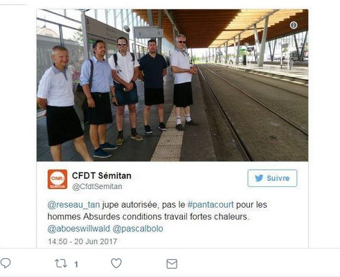 Η διεύθυνση τούς απαγορεύει να φορέσουν βερμούδα εν ώρα εργασίας, μέσα στο λεωφορείο. Αλλά επειδή στη Γαλλία έχει καύσωνα, οι οδηγοί, σε ένδειξη διαμαρτυρίας, φόρεσαν φούστες και καταγγέλλουν απαράδεκτες συνθήκες εργασίας.