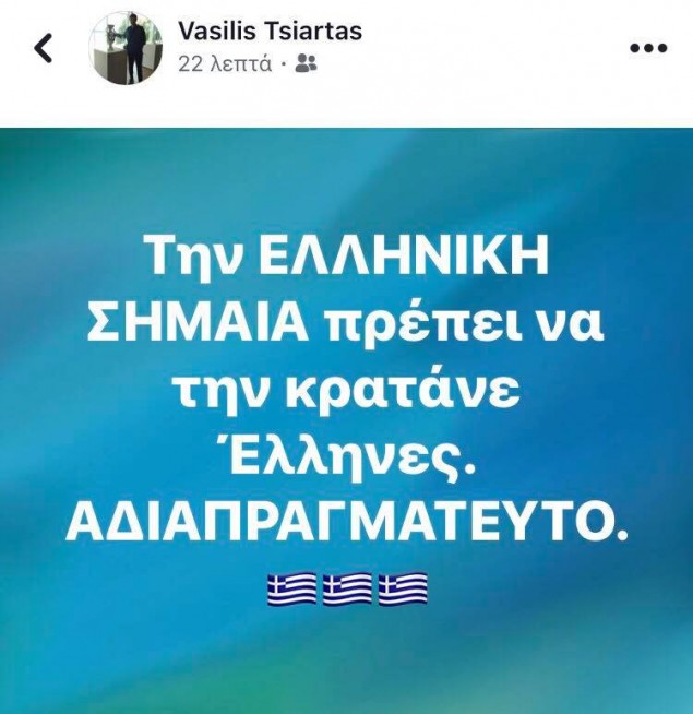Ο Βασίλης Τσιάρτας, λοιπόν, τοποθετήθηκε στα social media για το θέμα της ελληνικής σημαίας, γράφοντας: