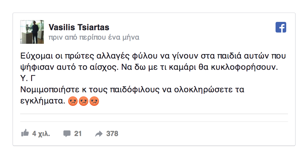 «Εύχομαι οι πρώτες αλλαγές φύλου να γίνουν στα παιδιά αυτών που ψήφισαν αυτό το αίσχος. Να δω με τι καμάρι θα κυκλοφορήσουν» έγραψε χθες στο προφίλ του στο facebook και συμπλήρωσε: «Νομιμοποιήστε κ τους παιδόφιλους να ολοκληρώσετε τα εγκλήματα».
