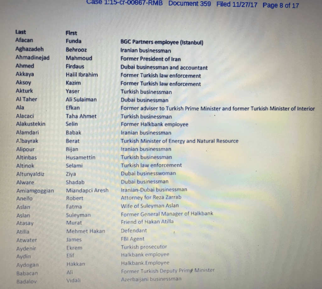 #3 Here is Reza Zarrab's name as it appears on a list given to prospective jurors in the Atilla trial of "potential witnesses in this case and names that may come up during trial." This means, of course, that #Zarrab could be a witness or merely that his name will be mentioned. pic.twitter.com/miHdWITf5f