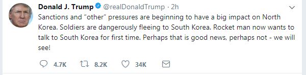 «Ο πυραυλάνθρωπος (Rocket man) τώρα θέλει να συνομιλήσει με την Νότια Κορέα για πρώτη φορά. Ίσως αυτά είναι καλά νέα, ίσως όχι – θα δούμε!», πρόσθεσε ο πρόεδρος των ΗΠΑ, αναφερόμενος στον Κιμ Γιονγκ Ουν.