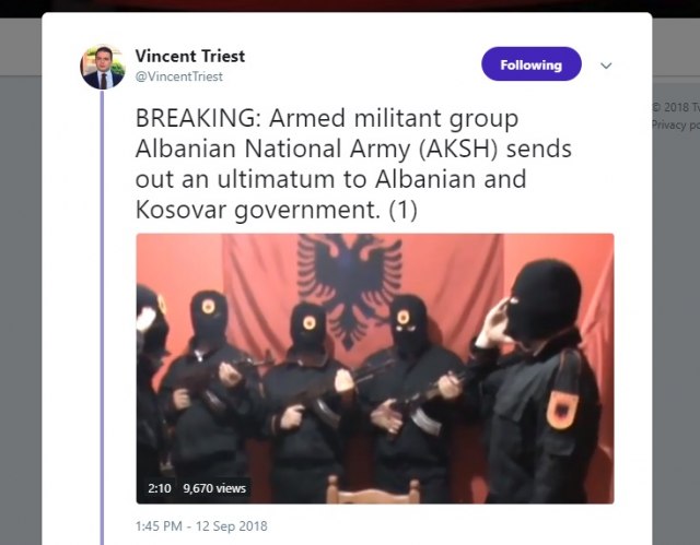 Ένοπλη εξτρεμιστική ομάδα που αποκαλείται ως «Αλβανικός Εθνικός Στρατός» δημοσίευσε βίντεο στο οποίο ζητά από την κυβέρνηση «να μην εμπορεύεται τα εδάφη», μια προειδοποίηση που απευθύνεται προς Σερβία ενώ απειλεί την Ελλάδα με εκδίωξη του Αρχιεπισκόπου Αλβανίας, Αναστάσιου.