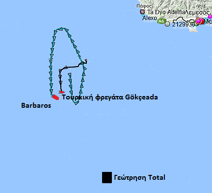 Το τουρκικό ερευνητικό σκάφος Barbaros συνοδευόμενο από την φρεγάτα Gokseada παραμένει στα νοτιοδυτικά της Κύπρου, χωρίς να προσεγγίζει το τεμάχιο 11 που γίνεται η γεώτρηση της Total. Τα τουρκικά πλοία κινούνται μεταξύ των τεμαχίων 6 και 7 της κυπριακής ΑΟΖ.