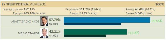 Νικητής των προεδρικών εκλογών στην Κύπρο με 56% έναντι 44% του αντιπάλου Σταύρου Μαλά, αναδείχθηκε ο Νίκος Αναστασιάδης.