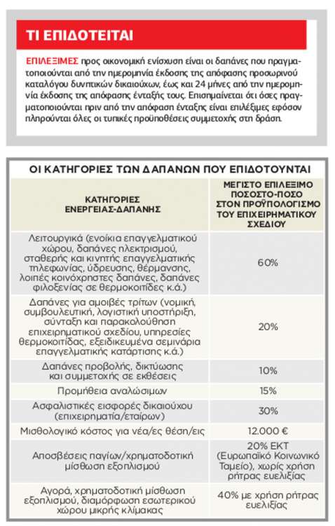 Επιλέξιμες προς οικονομική ενίσχυση είναι οι δαπάνες που πραγματοποιούνται από την ημερομηνία έκδοσης της απόφασης προσωρινού καταλόγου δυνητικών δικαιούχων, έως και 24 μήνες από την ημερομηνία έκδοσης της απόφασης ένταξής τους. Επισημαίνεται ότι όσες πραγματοποιούνται πριν από την απόφαση ένταξης είναι επιλέξιμες εφόσον πληρούνται όλες οι τυπικές προϋποθέσεις συμμετοχής στη δράση.