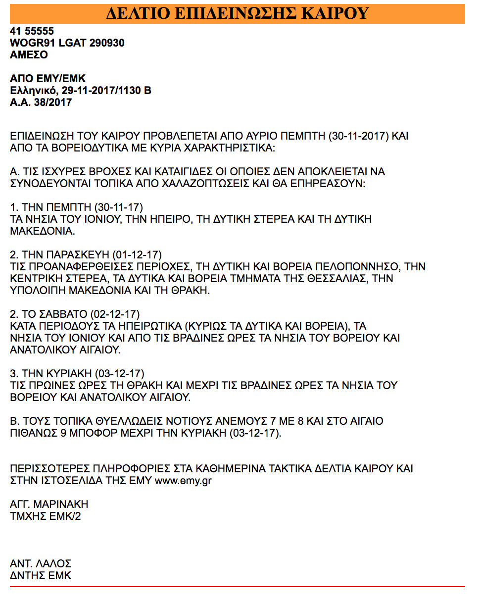 Άνεμοι: στα δυτικά δυτικοί νοτιοδυτικοί 4 με 6 μποφόρ, στα ανατολικά από νότιες διευθύνσεις 6 με 7 και στο βόρειο Αιγαίο 8 μποφόρ με βαθμιαία εξασθένηση.