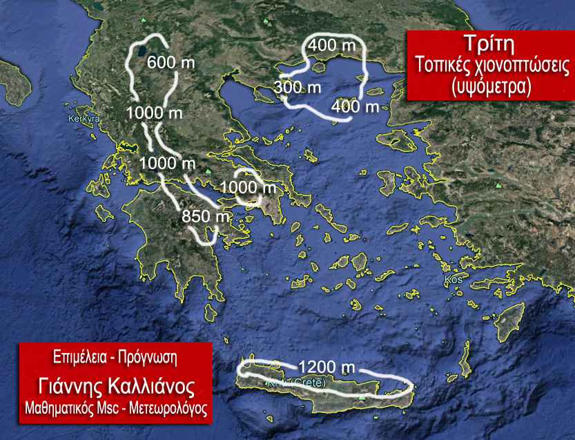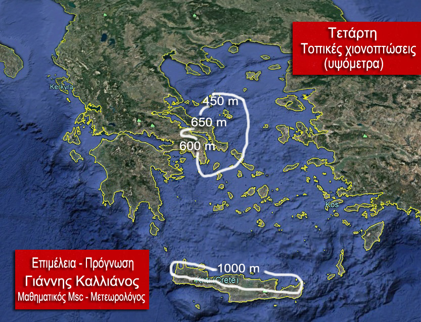 Πάνω από τα συγκεκριμένα υψόμετρα θα εκδηλώνονται και τοπικές χιονοπτώσεις εξασθενημένες κατά βάση, με εξαίρεση τα ορεινά της Κρήτης όπου νωρίς το πρωί τα φαινόμενα των χιονοπτώσεων θα είναι λίγο πιο ισχυρά.