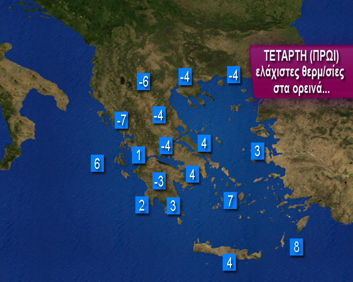 Ειδικά το πρωινό της Τετάρτης, οι ελάχιστες τιμές στις θερμοκρασίες των ορεινών τμημάτων της ηπειρωτικής Ελλάδας θα κατρακυλήσουν σε αρνητικές τιμές με αποτέλεσμα να δημιουργηθεί παγετός στα τμήματα αυτά. Στις περισσότερες κεντρικές και βόρειες ηπειρωτικές περιοχές θα επικρατήσει ξαστεριά με αποτέλεσμα οι συνθήκες να είναι ευνοϊκές ώστε να κατέβει ο υδράργυρος στις τιμές που φαίνονται στον χάρτη.