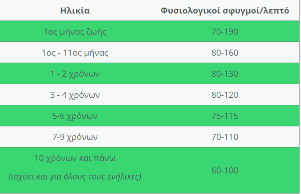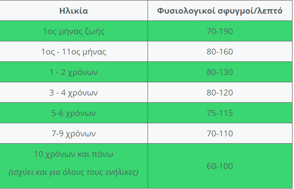 Ηλικία Φυσιολογικοί σφυγμοί/λεπτό