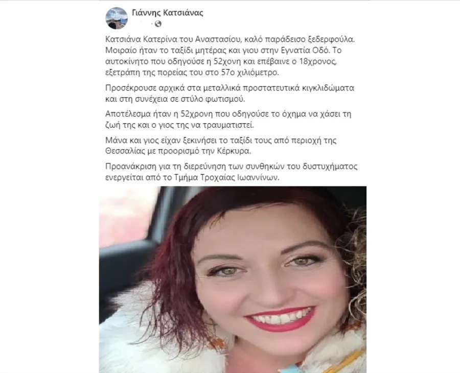 Μοιραίο ήταν το ταξίδι μητέρας και γιου στην Εγνατία Οδό. Το αυτοκίνητο που οδηγούσε η 52χρονη και επέβαινε ο 18χρονος, εξετράπη της πορείας του στο 57ο χιλιόμετρο.