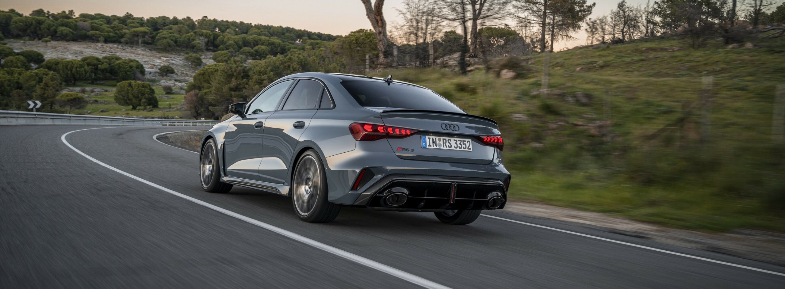 Το RS3 διαθέτει στάνταρ ζάντες αλουμινίου 19 ιντσών σε ματ μαύρο χρώμα με σχέδιο 5 ακτίνων. Διατίθενται προαιρετικά οι ζάντες αλουμινίου σε σχέδιο motorsport που είναι γνωστές από την έκδοση RS3 Performance, με δέκα εντυπωσιακές εγκάρσιες ακτίνες, είτε σε ματ σκούρο γκρι, είτε σε γυαλιστερό μαύρο μεταλλικό. Περισσότερη εξατομίκευση προσφέρουν τα πακέτα από ανθρακονήματα και σε μαύρο γυαλιστερό, τα οποία διακοσμούν τους μπροστινούς αεραγωγούς και τα πλαϊνά μαρσπιέ. Τη σχεδίαση ολοκληρώνουν τα καλύμματα των εξωτερικών καθρεπτών στο χρώμα αμαξώματος, σε μαύρο ή από ανθρακονήματα.