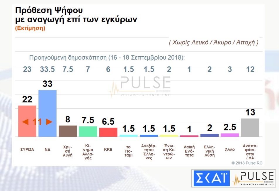 Προβάδισμα που φτάνει τις 11 μονάδες (στην πρόθεση ψήφου με αναγωγή επί των εγκύρων) καταγράφει η ΝΔ έναντι του ΣΥΡΙΖΑ σε δημοσκόπηση της Pulse.