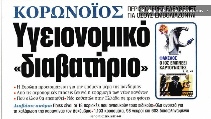 Στο εξώφυλλό τους τα “Νέα” μας πληροφορούν ότι όσοι κάνουν τα εμβόλια θα έχουν “περισσότερες ελευθερίες” και αναφέρεται στην απαράδεκτη απόφαση των αεροπορικών εταιρειών να εφαρμόσουν τα περί “διαβατηρίου”.