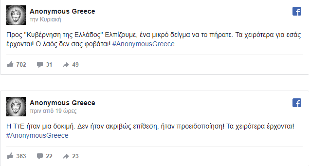 «Η ΤτΕ ήταν μια δοκιμή. Δεν ήταν ακριβώς επίθεση, ήταν προειδοποίηση! Τα χειρότερα έρχονται!» #AnonymousGreece», προειδοποιούν επίσης σε χθεσινή ανάρτησή τους στο Facebook .