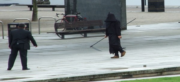 Ένα παράξενο συμβάν έλαβε χώρα κατά την διεξαγωγή της αμφιλεγόμενης ετήσιας έκθεσης οπλικών συστημάτων στο Λονδίνο, όπου ένας διαδηλωτής μεταμφιεσμένος σε Χάρο, με μαύρη κουκούλα και δρεπάνι στο χέρι, έκανε την εμφάνιση του προκαλώντας την άμεση κινητοποίηση της ιδιωτικής εταιρείας φύλαξης της διοργάνωσης.
